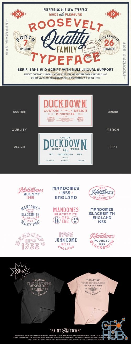 Roosevelt Font Family is handmade vintage script, serif and some serif fonts. Inspired by classic western culture, custom culture motorcycle and combining with vintage touch. There's so many fonts that would be perfect to combine in your design, especially on vintage design. With bonus illustration in this package, this fonts are great for logotype, badges, clothing, poster, and much more. This fonts comes with opentype features and adobe illustrator format for illustration pack also many alternative style to improve your design.