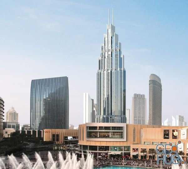 Full 3D scene of the urban exterior with an entertainment complex and fountains on the waterfront. Includes all textures, materials, rendering and lighting settings.