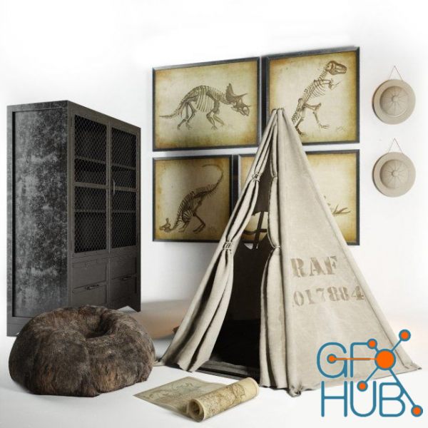 3D-model – Restoration hardware Wigwam, cupboard, hat, ottoman, paintings