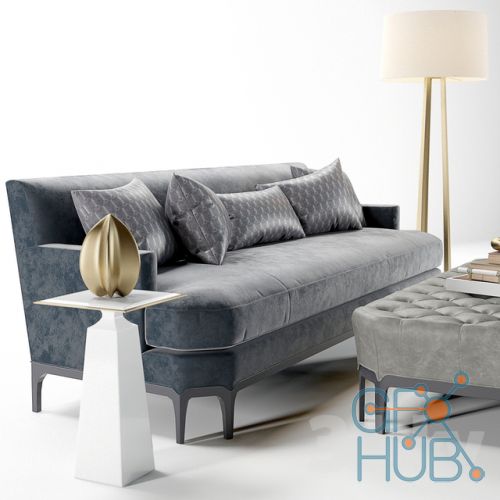 High-detailed 3D set of Bakers Celestite Sofa, Cocktail ottoman, Viridine Square.