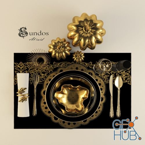 3d-model of classic style dining ware Sundos. Set includes golden pumpkins, plates, spoon, fork, knife, napkin, glasses.